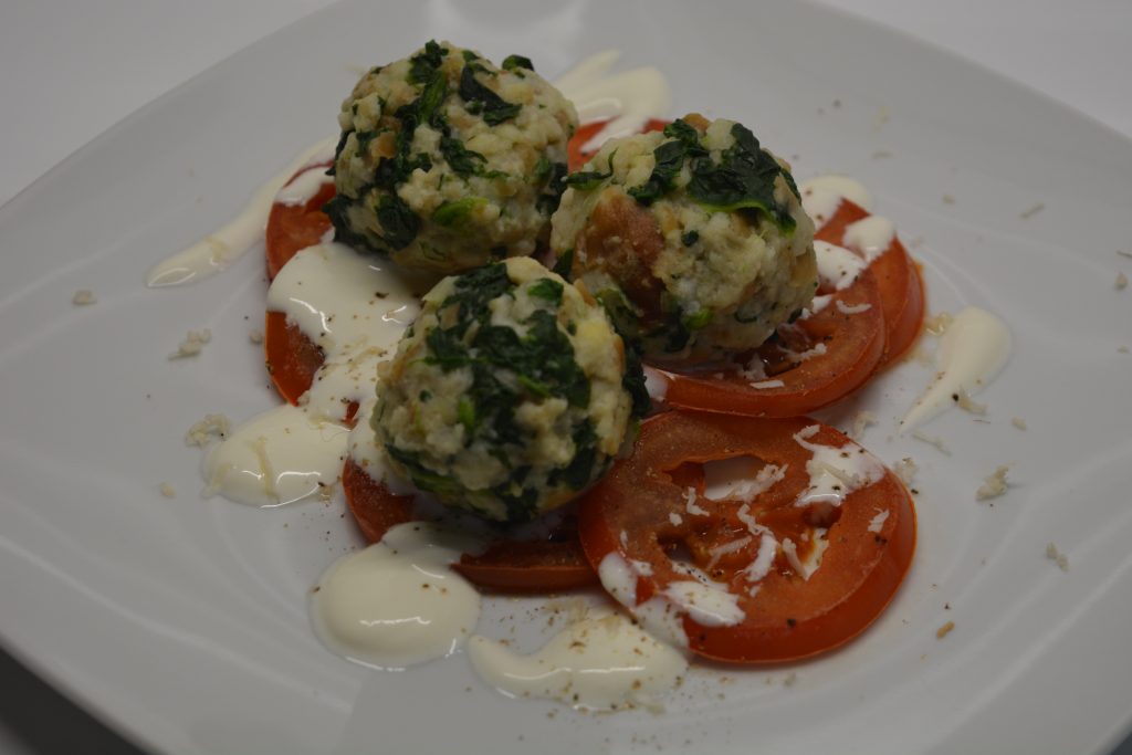 Hausgemachte Spinatknödel auf gerillten Tomatenscheiben mit Creme- Fraiche Topping und frisch geriebenem Merrettich!