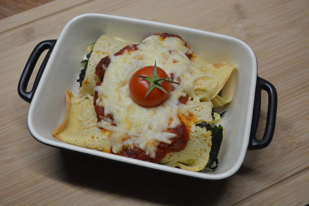 Hausgemachte Crespelle, gefüllt mit Spinat und Feta. Überbacken mit einer leichten Tomatensoße und Käse. Für alle Vegetarier und Nichtvegetarier ein absolutes Highlight!
