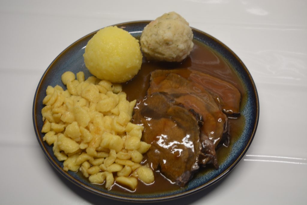 Wir liefern auch verschiedene Braten mit Kartoffel- oder Semmelkloß, oder Spätzle. Hier sehen sie unseren Schweinebraten in Dunkelbiersoße!